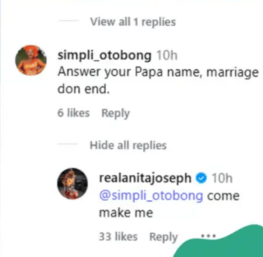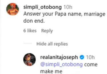 L’actrice nigériane Anita Joseph réagit fermement à un fan qui lui conseille de reprendre son nom de jeune fille, alors que des rumeurs de séparation avec son mari MC Fish circulent en ligne.